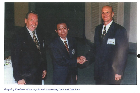 Dr. Zack T. Pate congratulates Soo-Byung Choi on being elected president of the World Association of Nuclear Operators in 1999. Choi was president and CEO of Korea Electric Power Company. He succeeded Dr. Allan Kupcis (left), former president and CEO of Ontario Hydro, who served as WANO’s president from 1997 to 1999.
