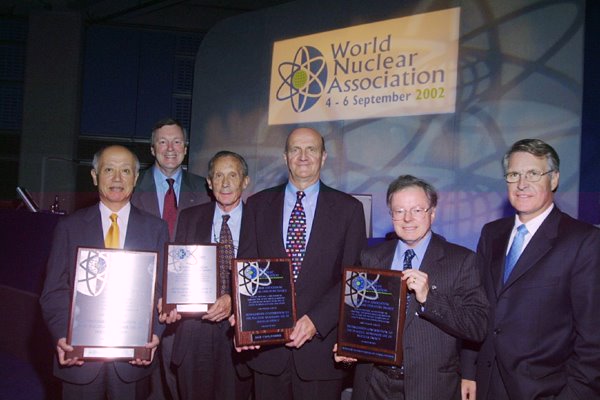 In 2002, Dr. Pate (fourth from left) was honored by the World Nuclear Association for his “distinguished contribution to the peaceful worldwide uses of nuclear energy” as a founder and leader of WANO. Dr. Pate is Chairman Emeritus of both INPO and WANO and served as chairman of the World Nuclear University (WNU). Honored along with Dr. Pate were Hajimu Maeda, chairman of WANO at the time; Rémy Carle, WANO’s second chairman; and Andrew Clarke, the first director of the WANO coordinating Center. On the back row is WNA director general John Ritch.
